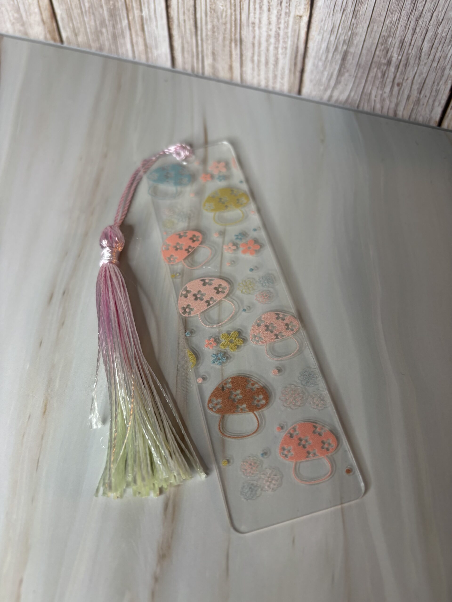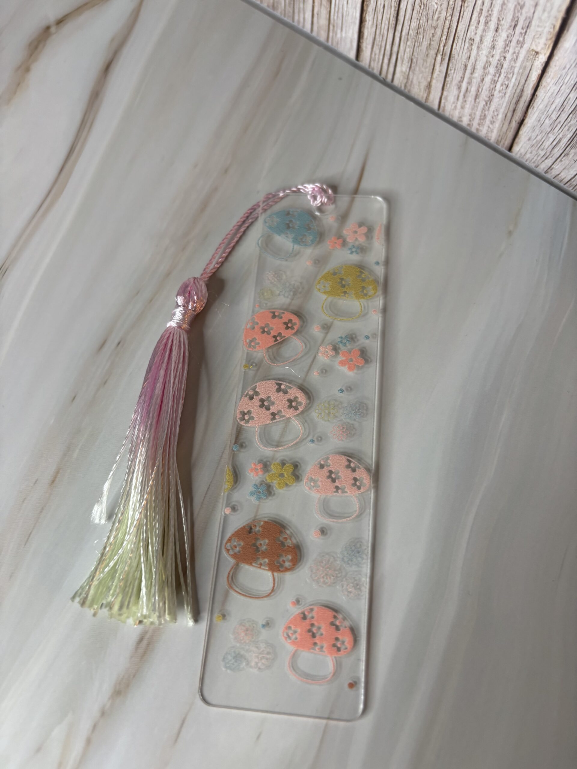 Boekenlegger sticker paddestoelen aqrylplaatje met kwastje.