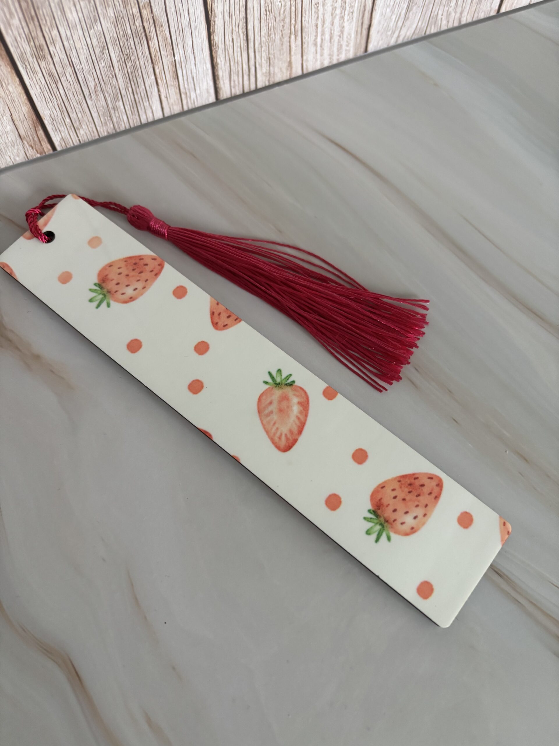 Boekenlegger hout- 2 kanten aardbeien gesublimeerd