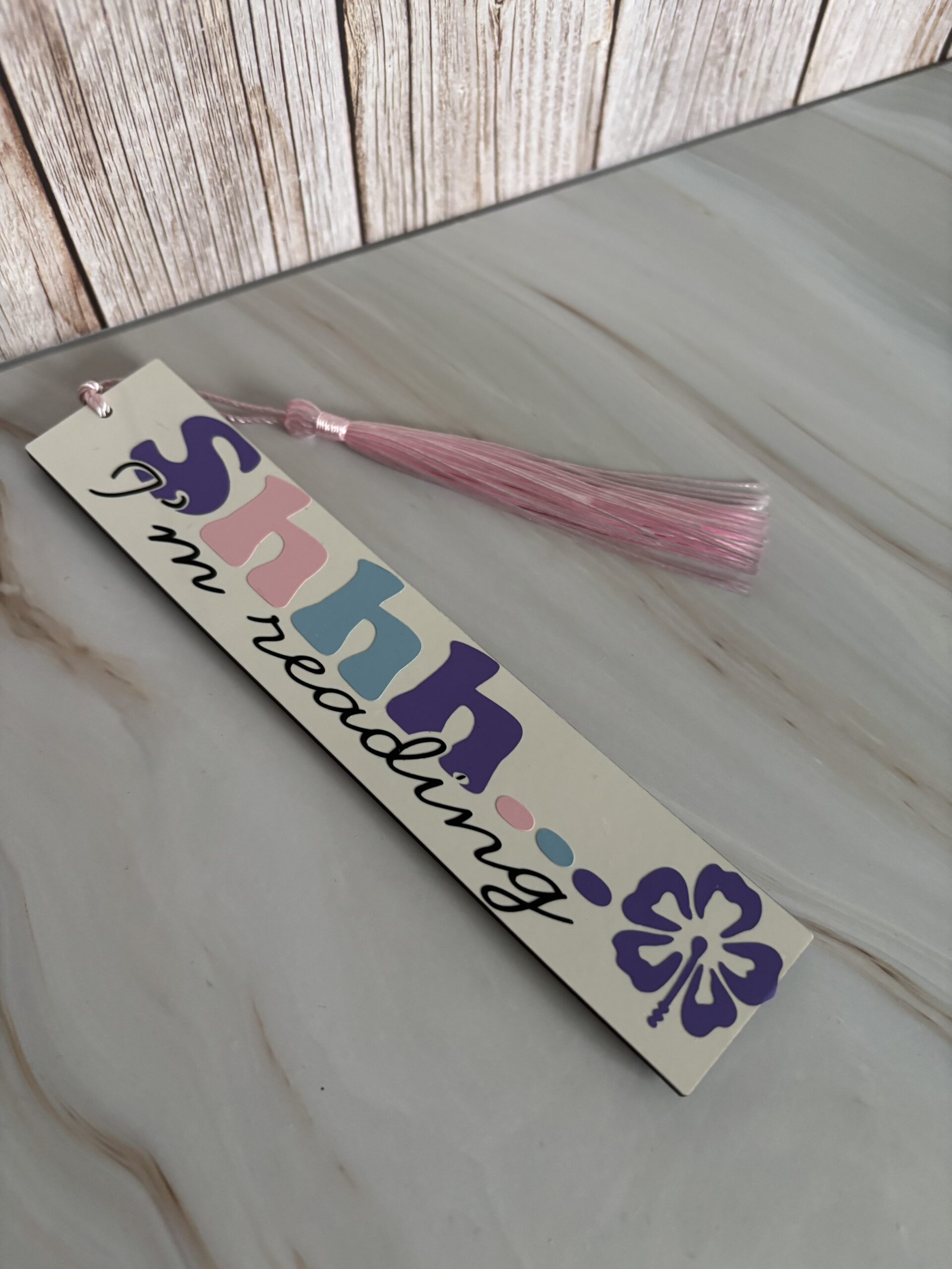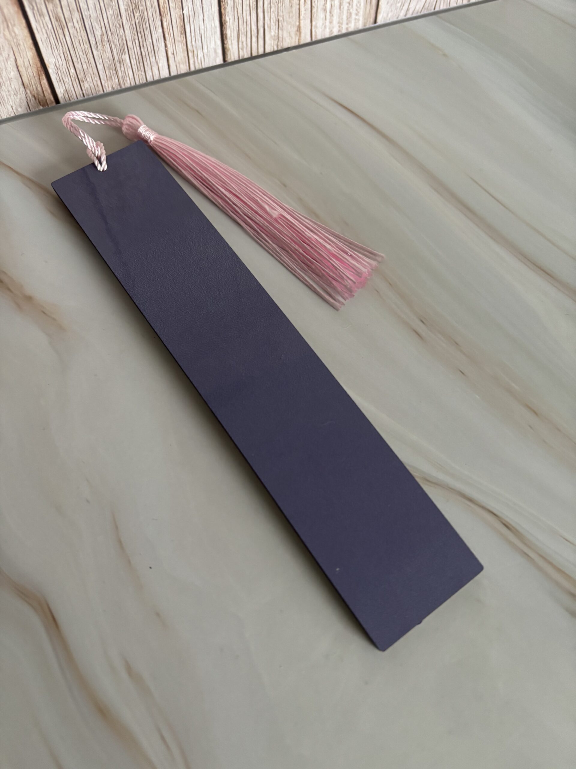 Boekenlegger hout- voorkant acryl- achterkant paars gesublimeerd met roos kwastje.