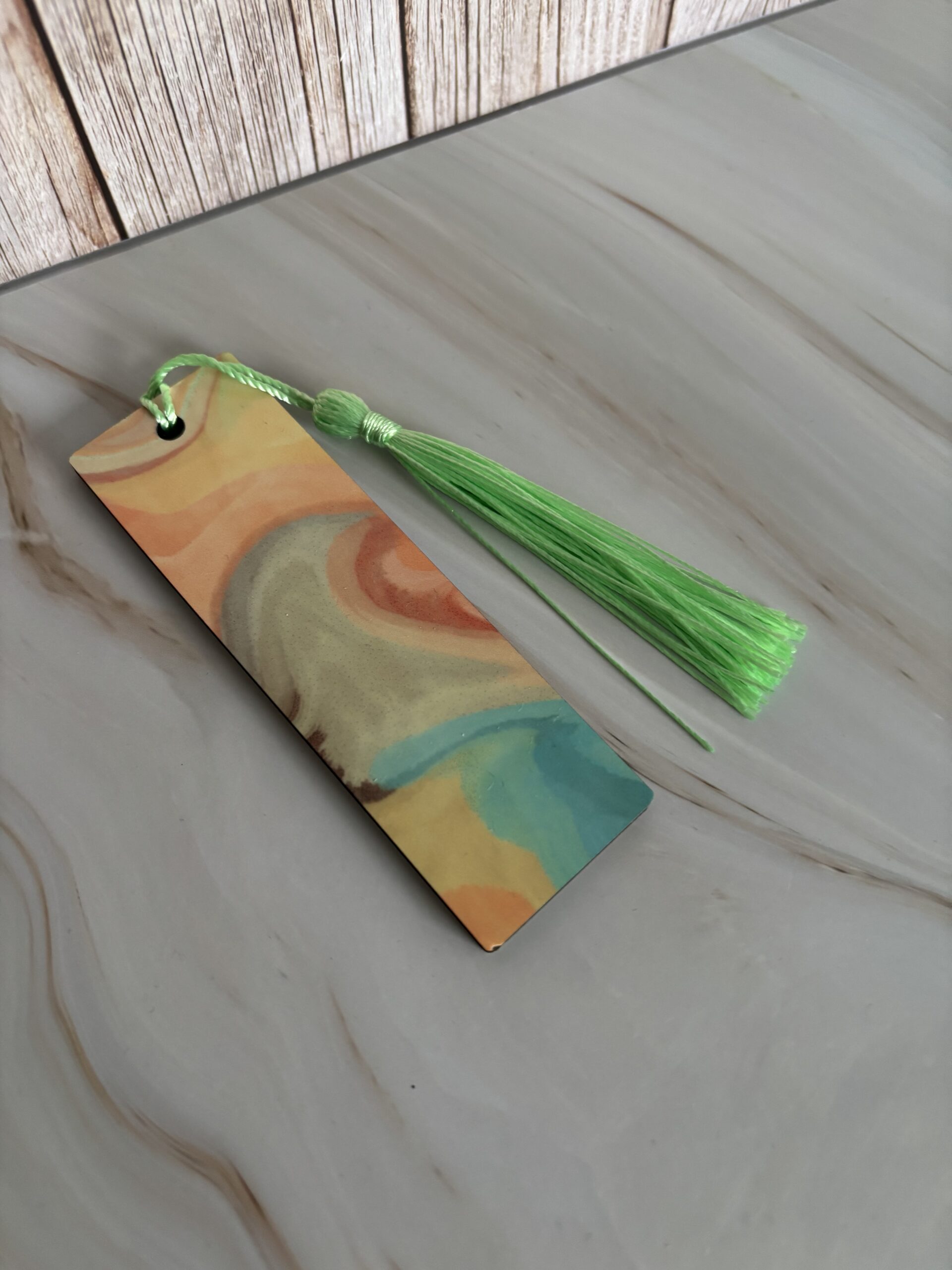 Boekenlegger hout- beide kanten gesublimeerd met lichtgroen kwastje.