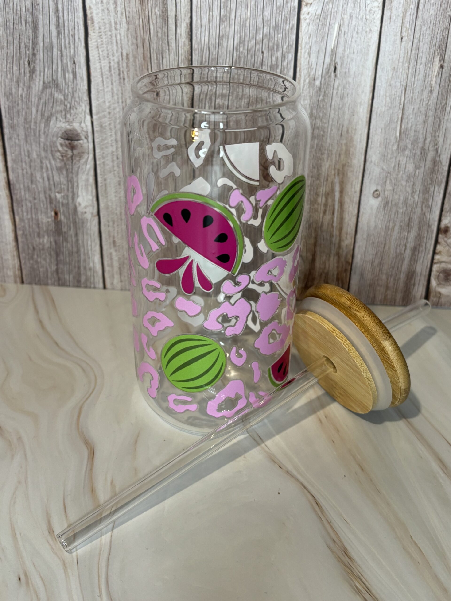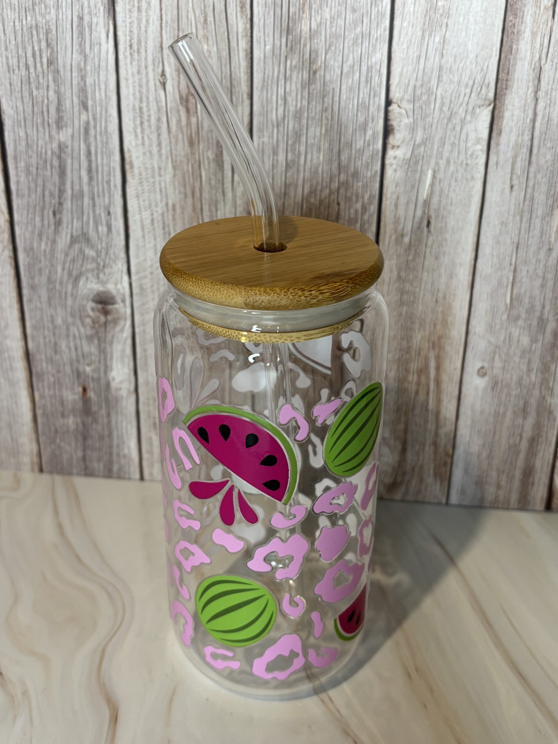 Glazen drinkbeker met deksel en rietje, sticker watermeloen
