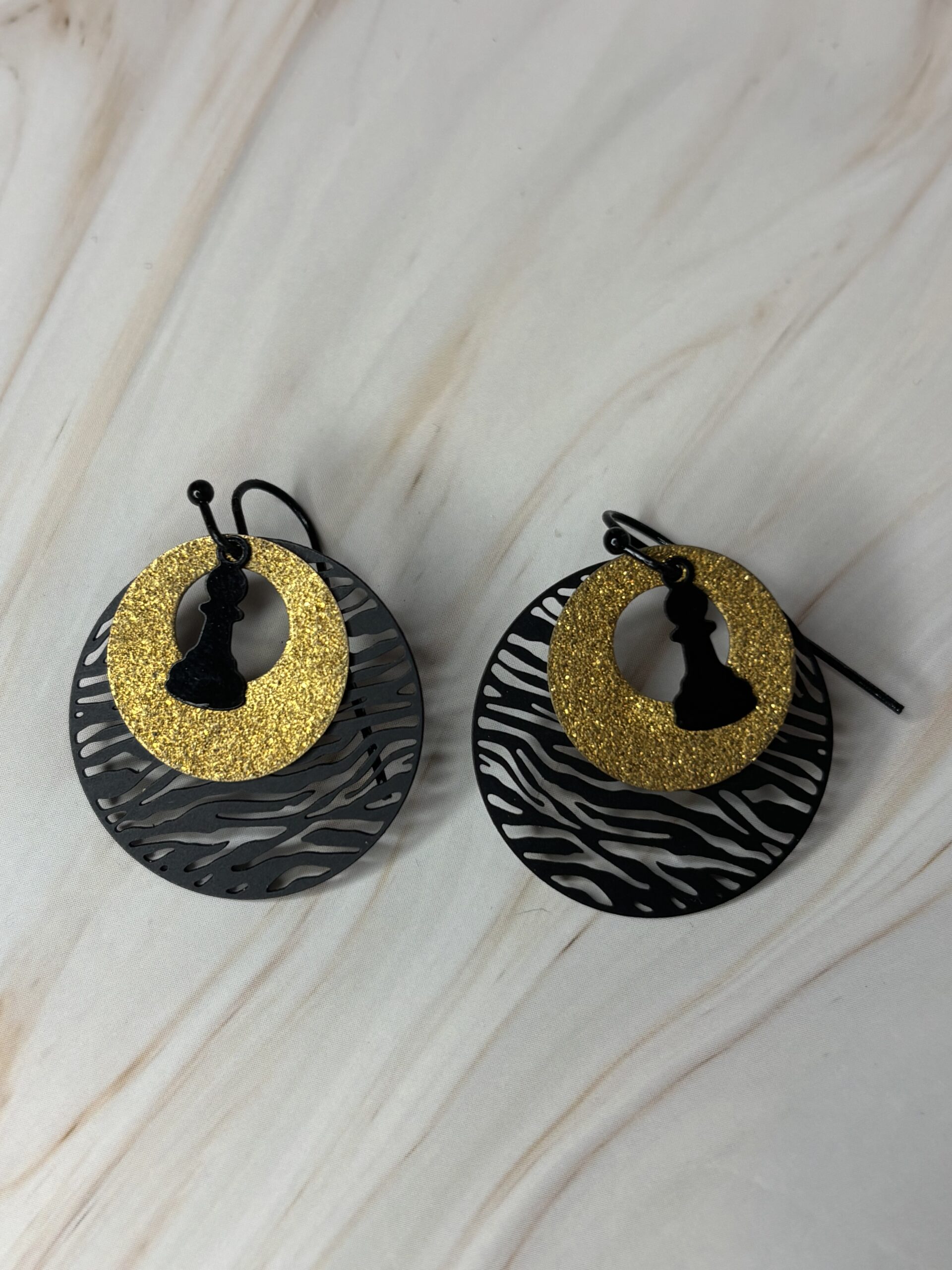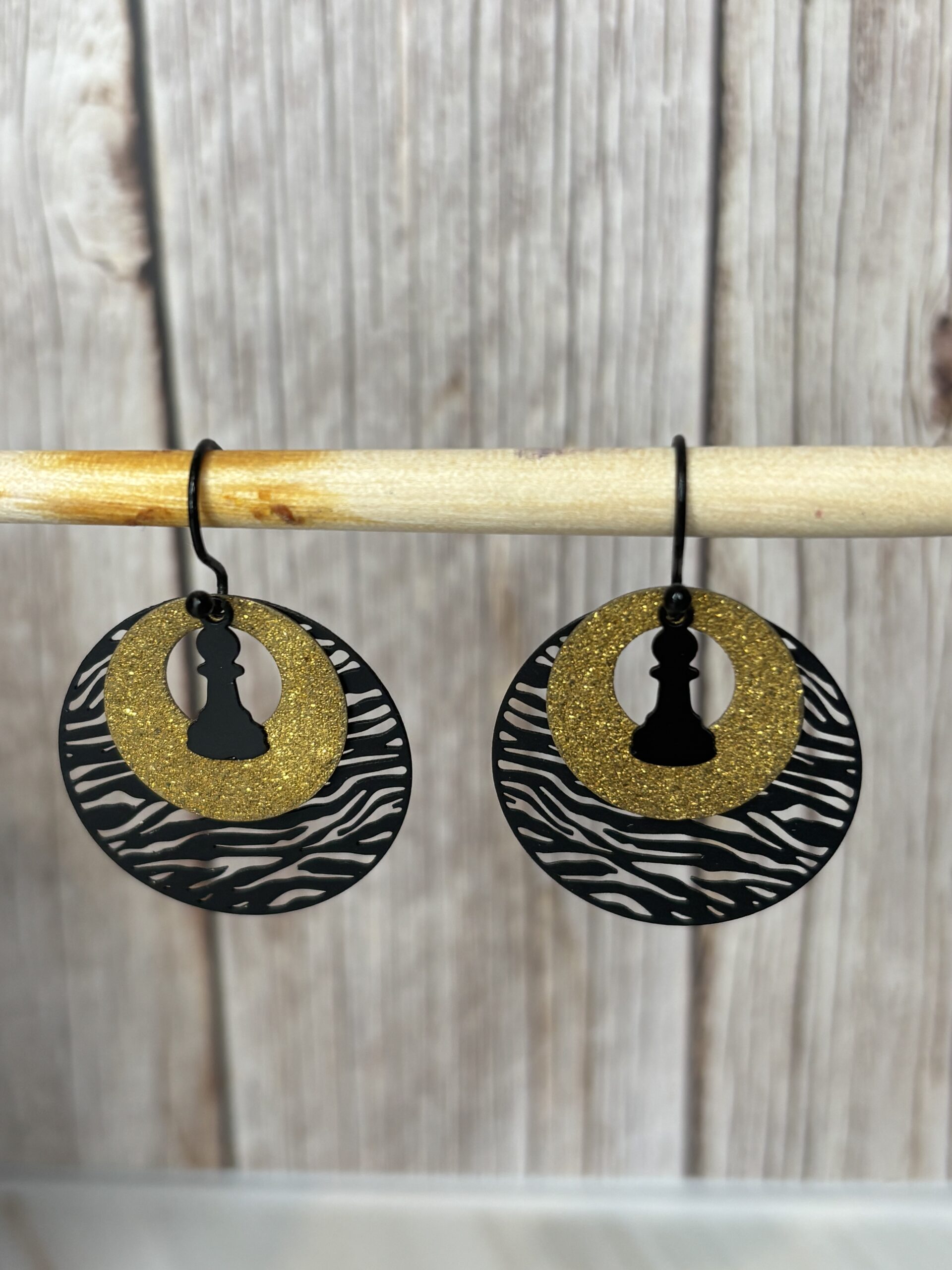 zwart zebra rond met goudkleurig rondje en zwart pion.