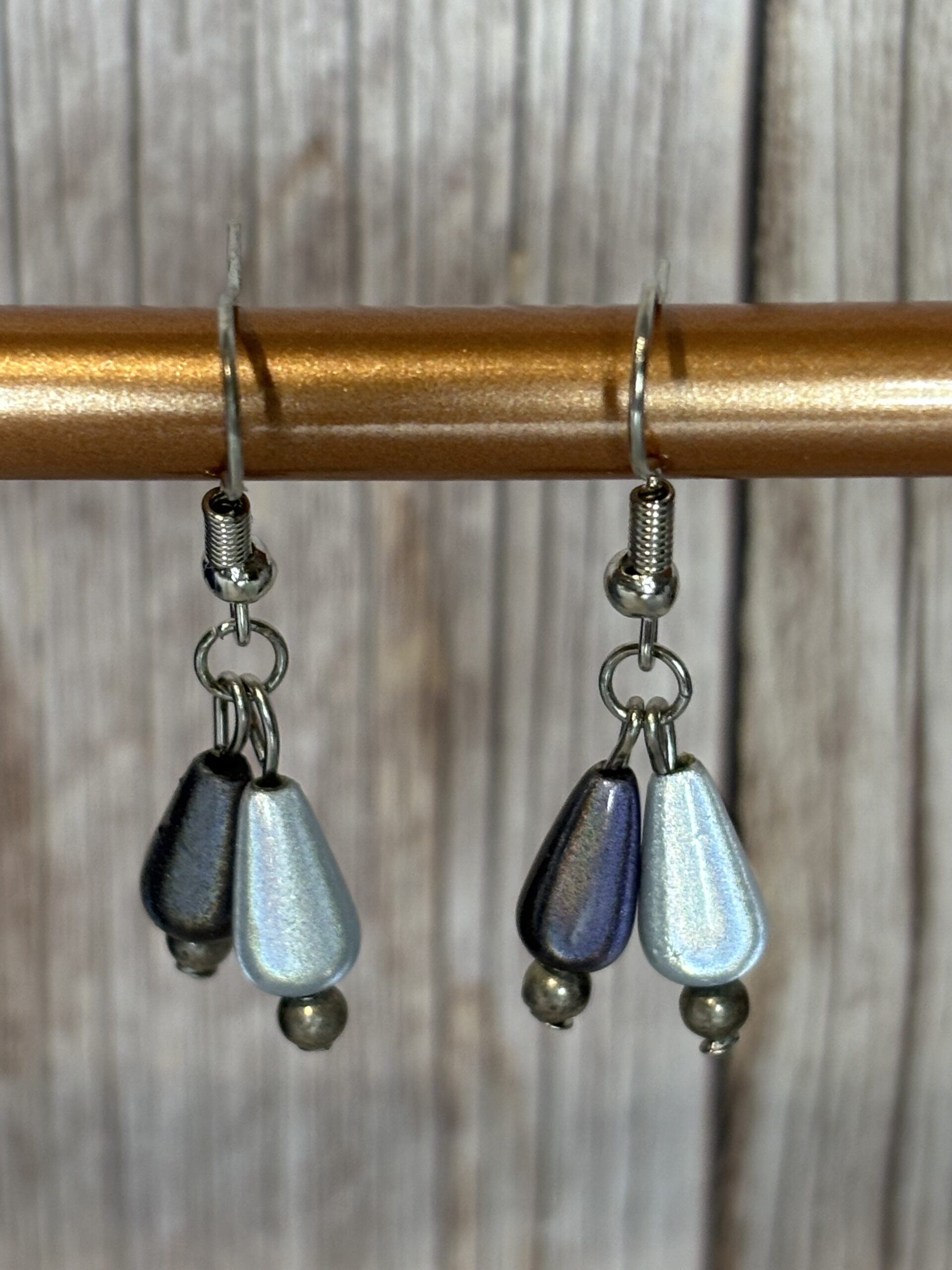 Oorhaakjes antiek zilver stainless steel met paarse en grijze druppel parels.