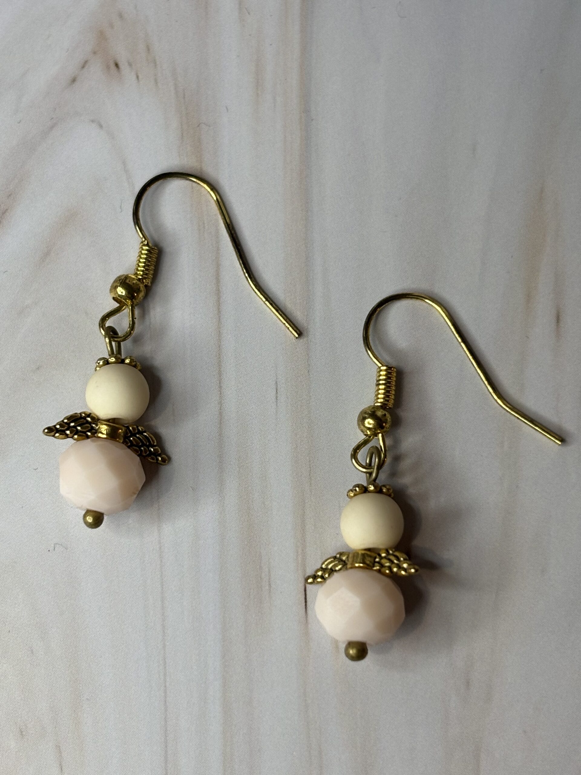 Oorhaakjes goudkleurig stainless steel met engeltje gevormd met lichtroze parels.