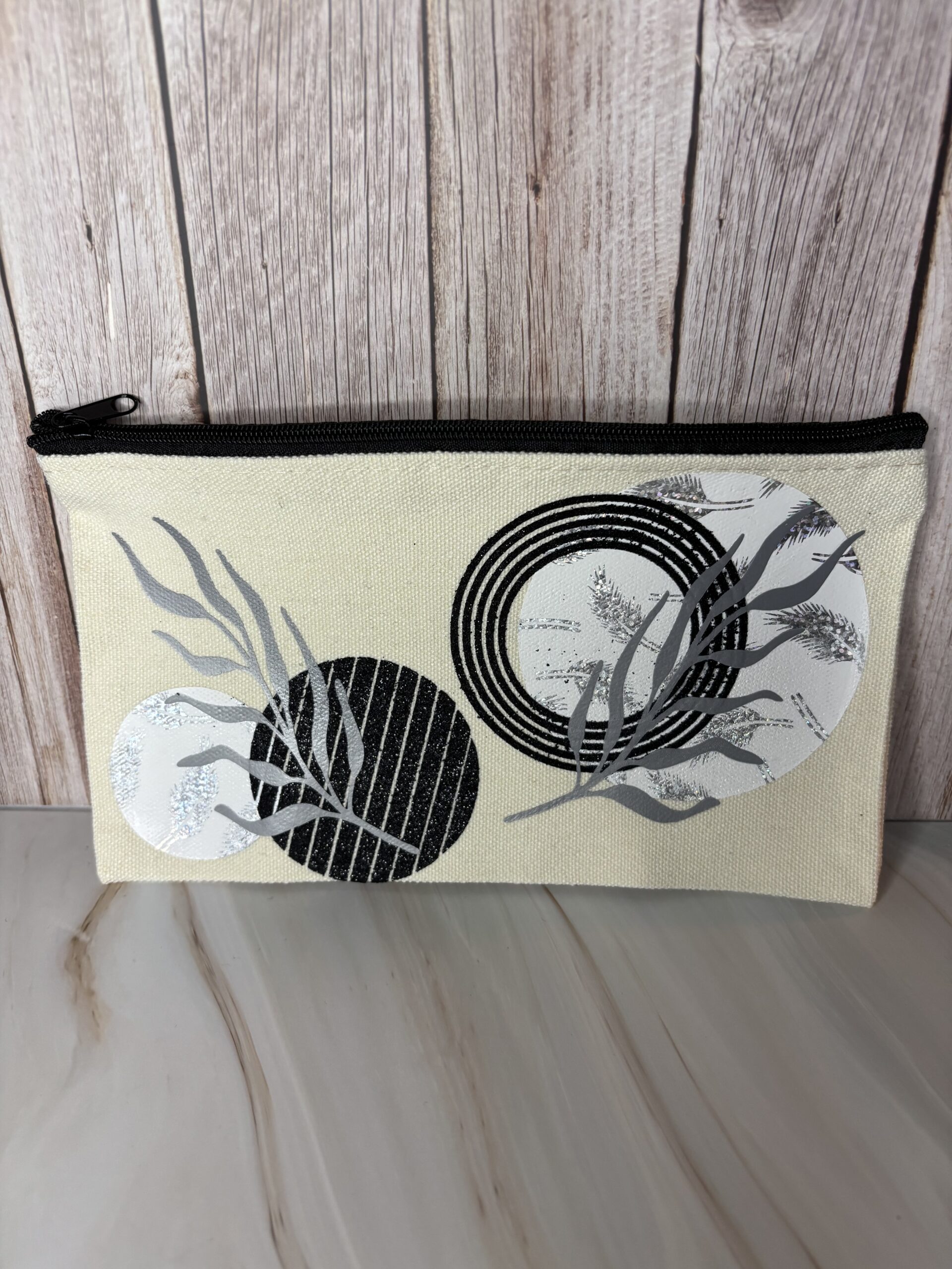 Stoffen gebroken wit pennenzakje met zwarte rits, bedrukt met iron-on.