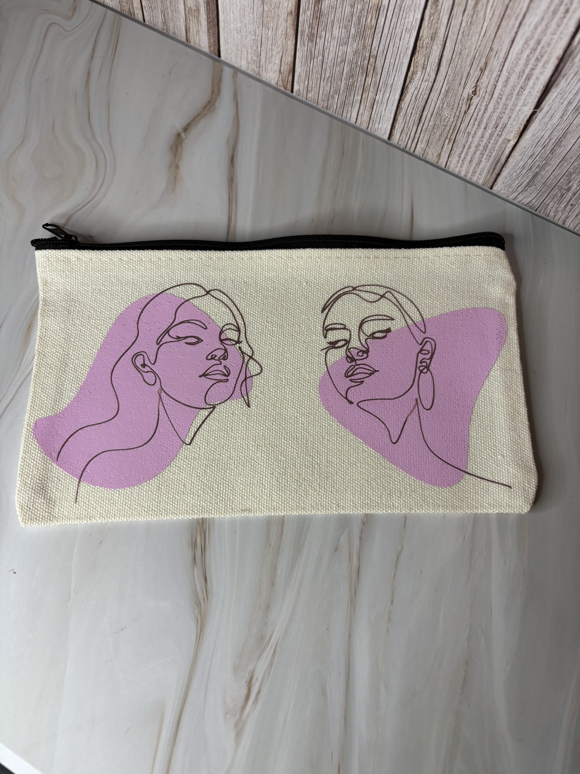 Stoffen gebroken wit toilettas met zwarte rits, bedrukt met iron-on.