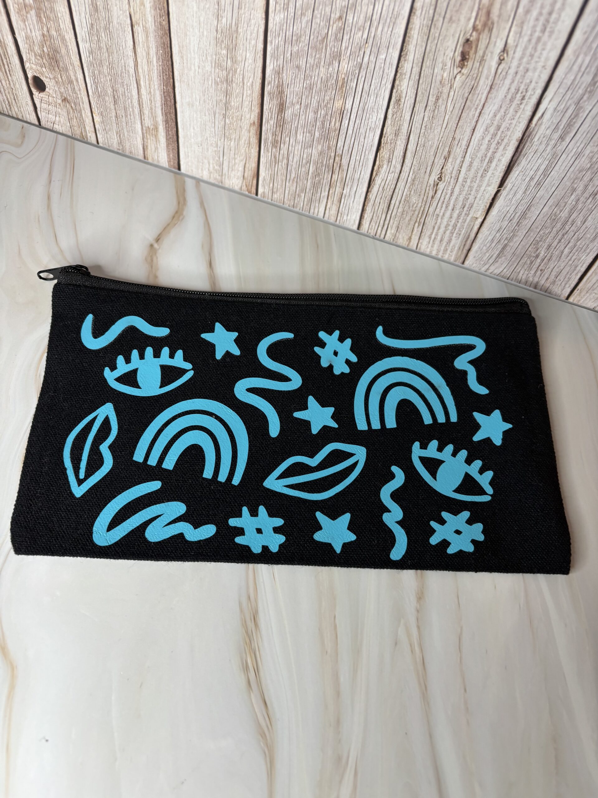 Stoffen zwarte toilettas met zwarte rits, bedrukt met iron-on.