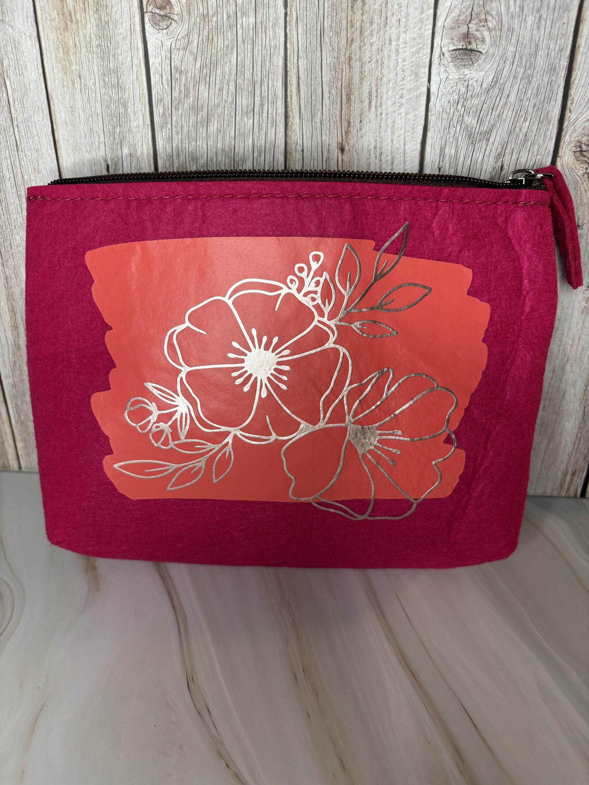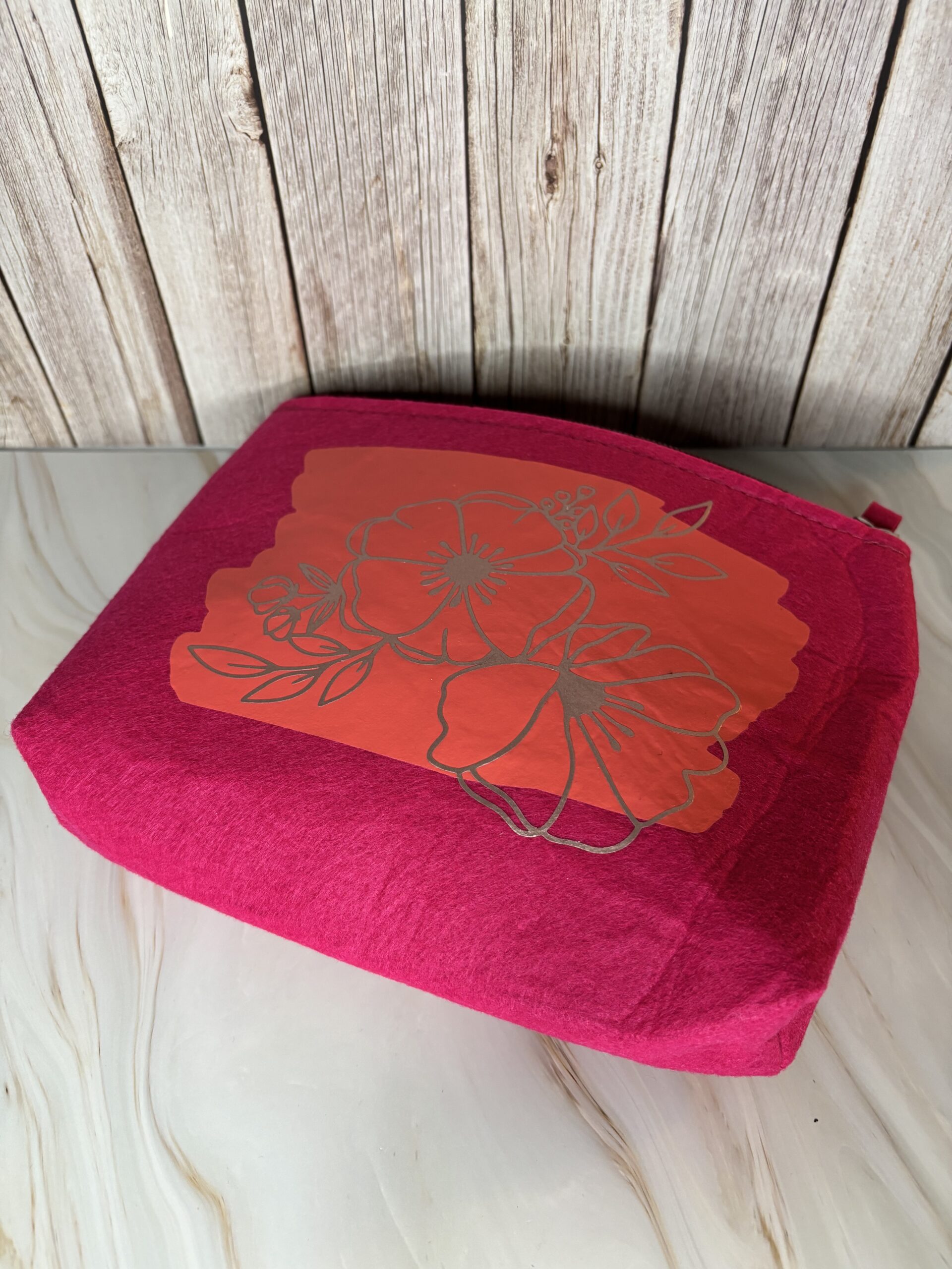 Vilten roze toilettas met bloemen.
