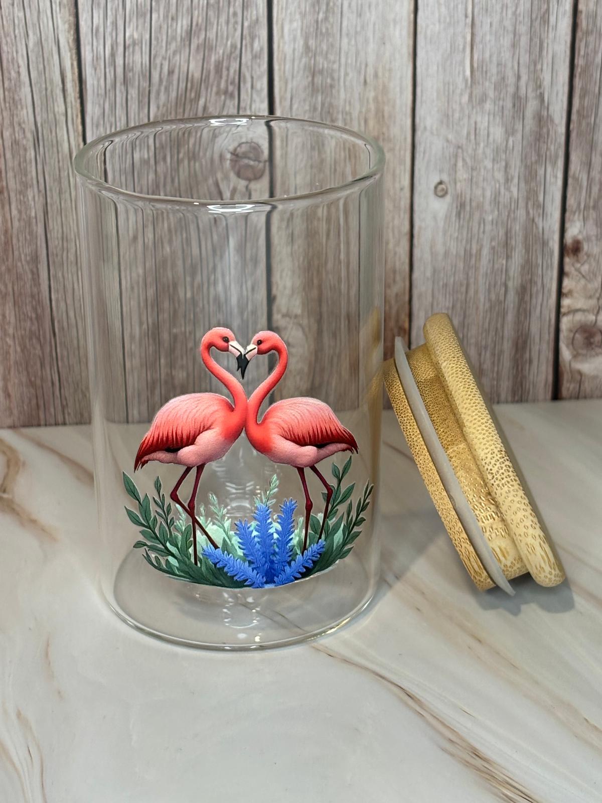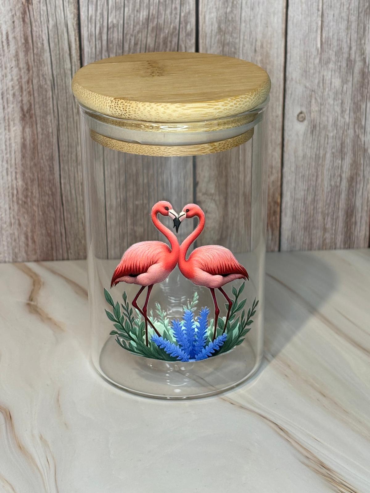 Glazen voorraadpot met bamboe deksel – Flamingo Love design-sticker-10cm