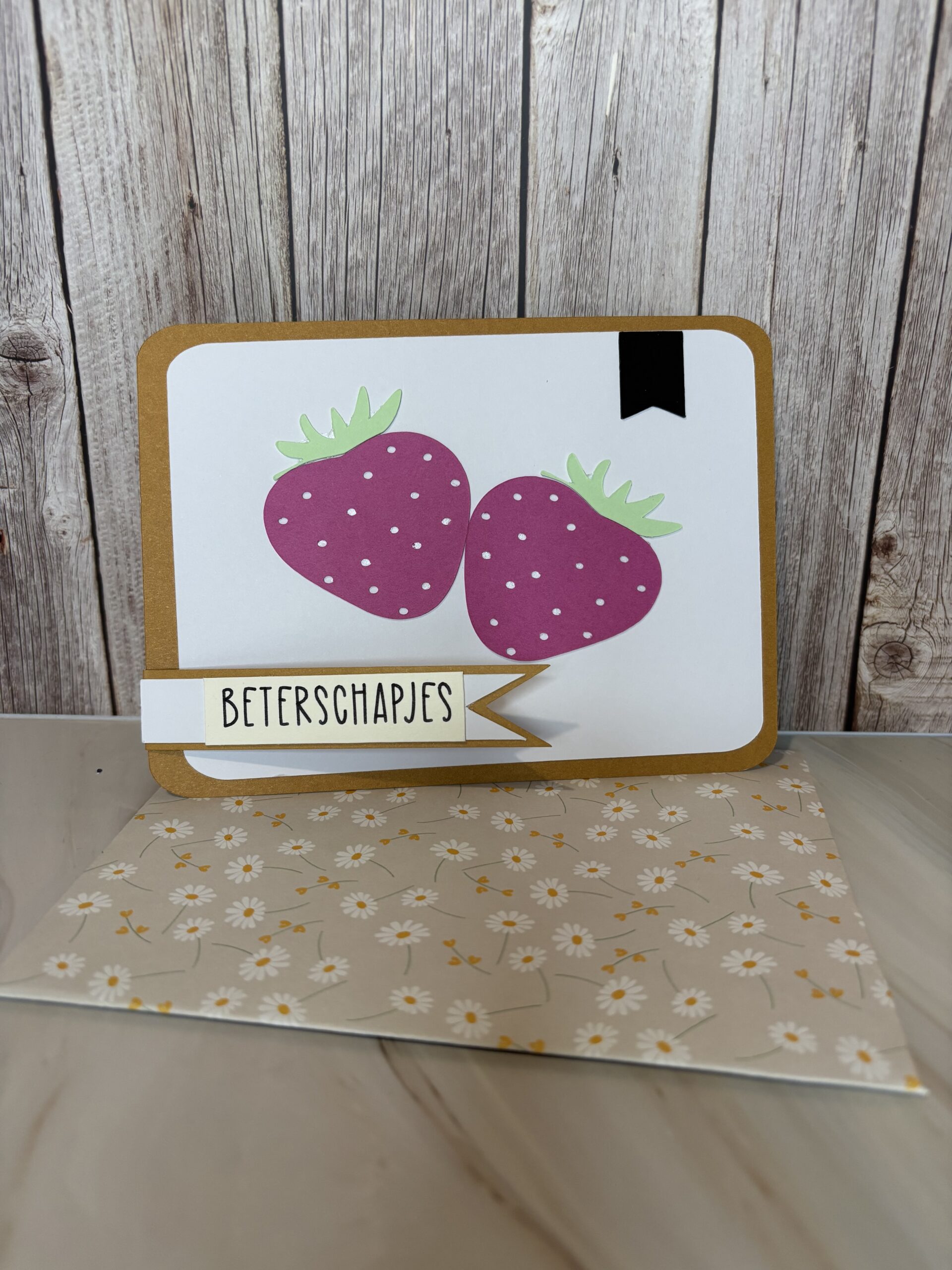 Enkelvoudige kaart met aardbeien en  bloemetjesenvelop.