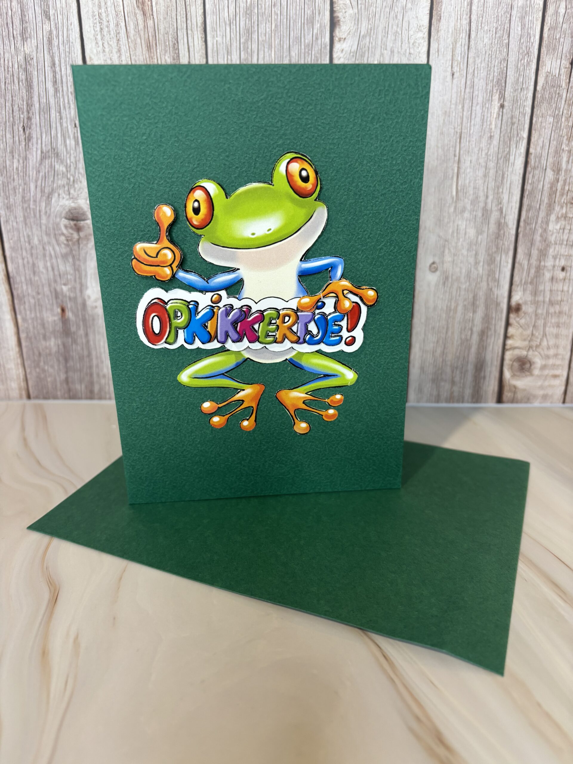 Dubbelgevouwen groene kaart met kikker en groene envelop.