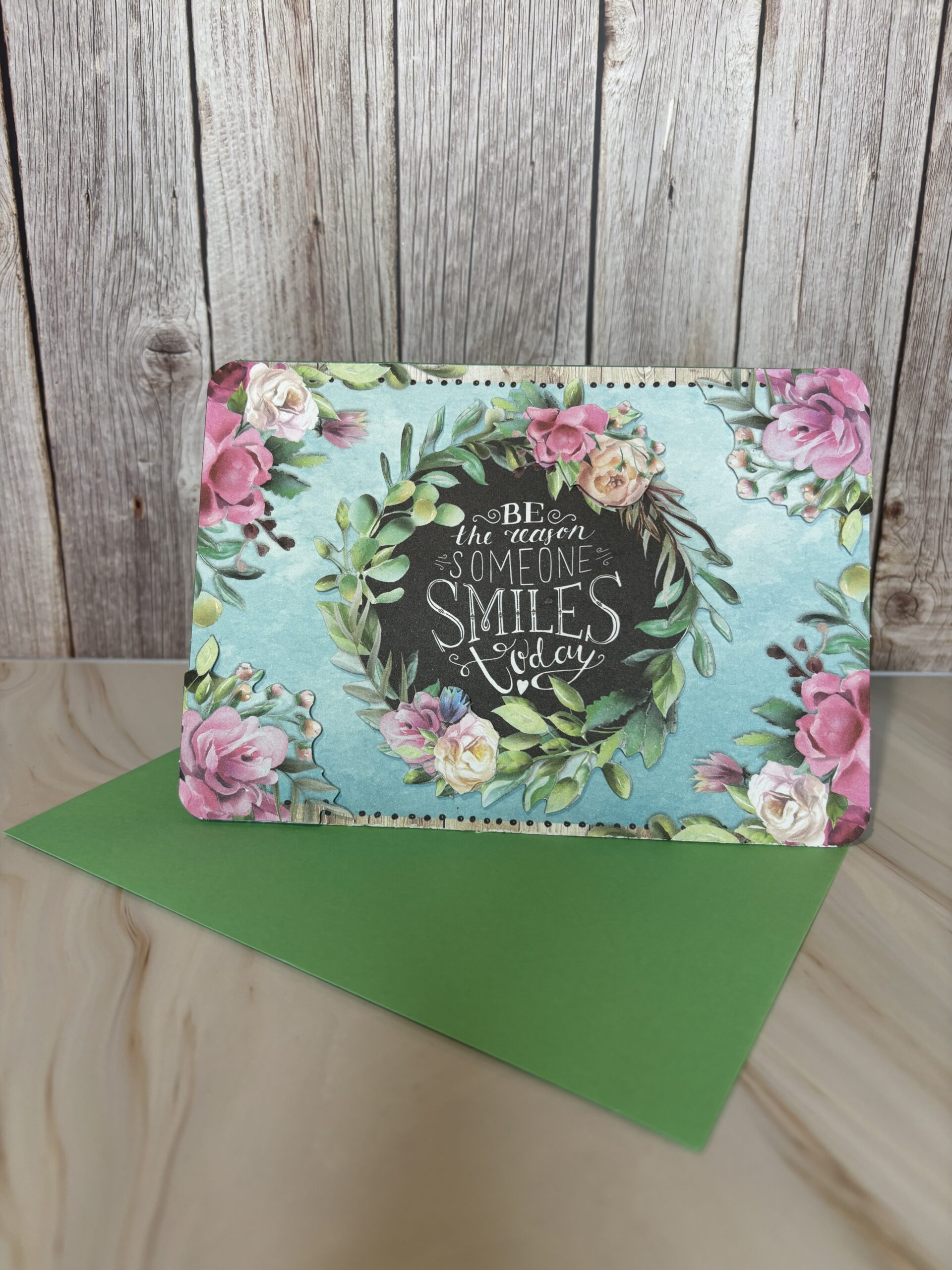 Dubbelgevouwen groene kaart met bloemen en groene envelop.