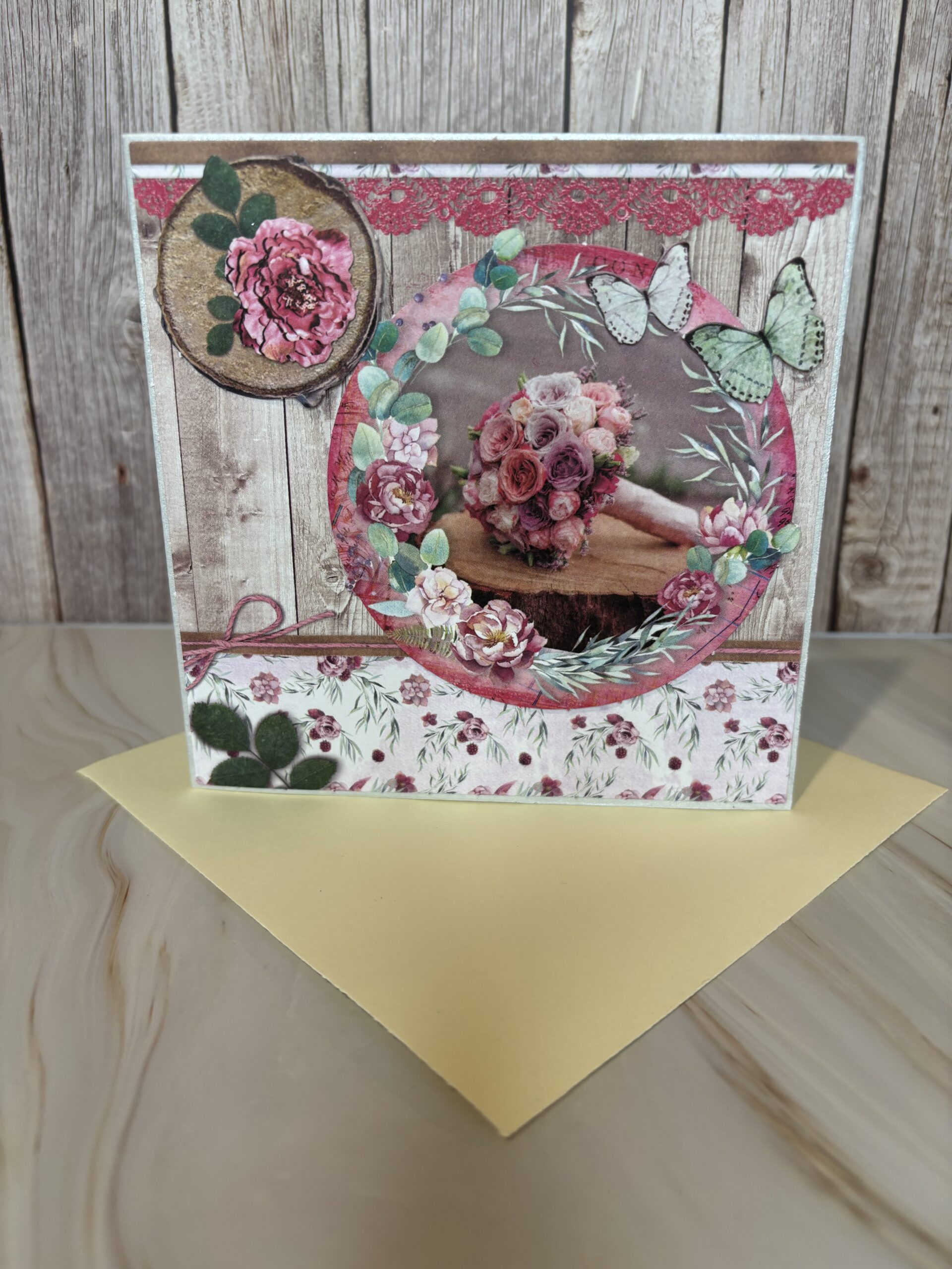 Dubbelgevouwen grijze kaart met bloemen en lichtgele envelop.