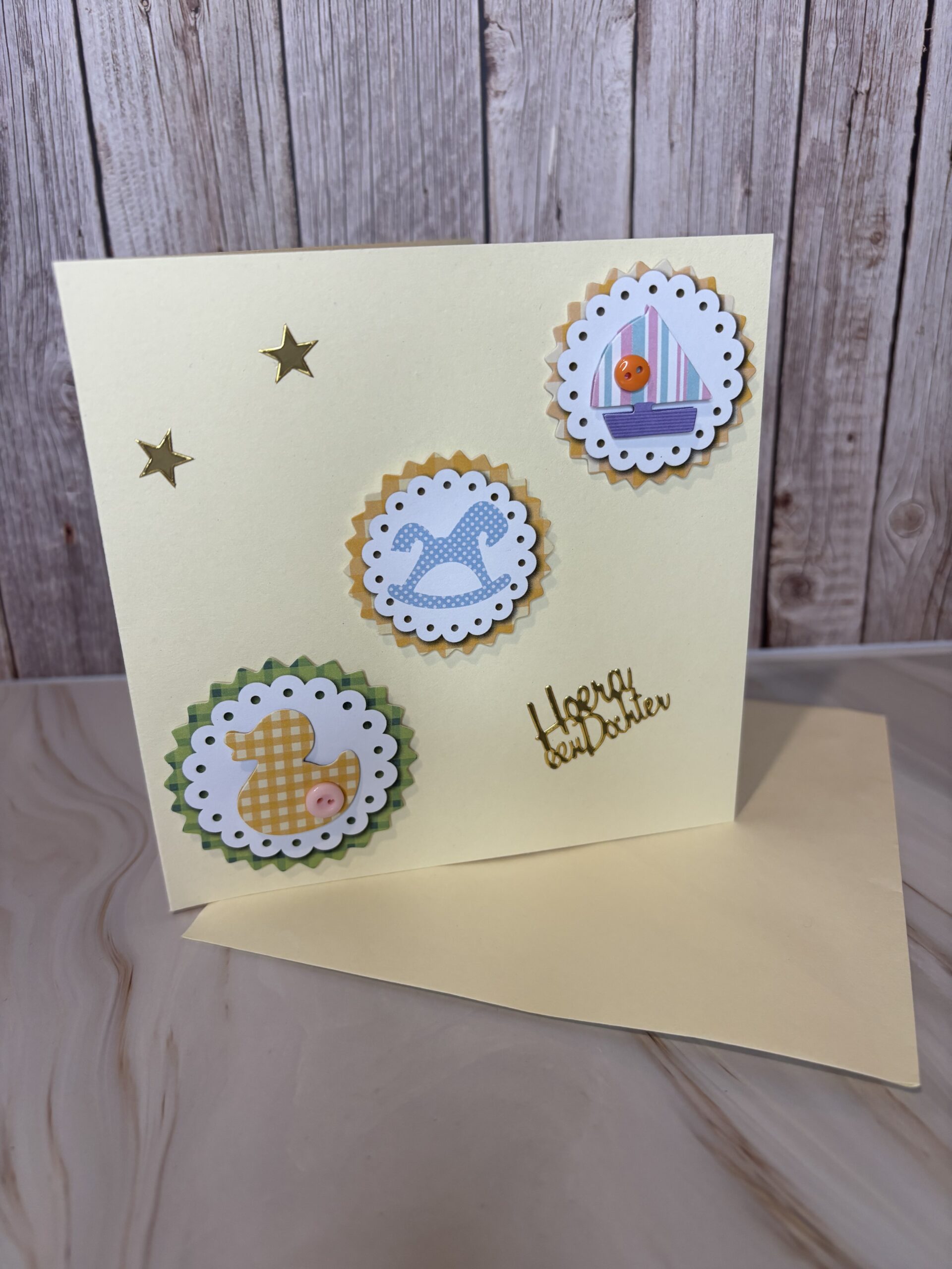 Hoera een dochter. Geelkleurige kaart met gele envelop 13cmx13cm.