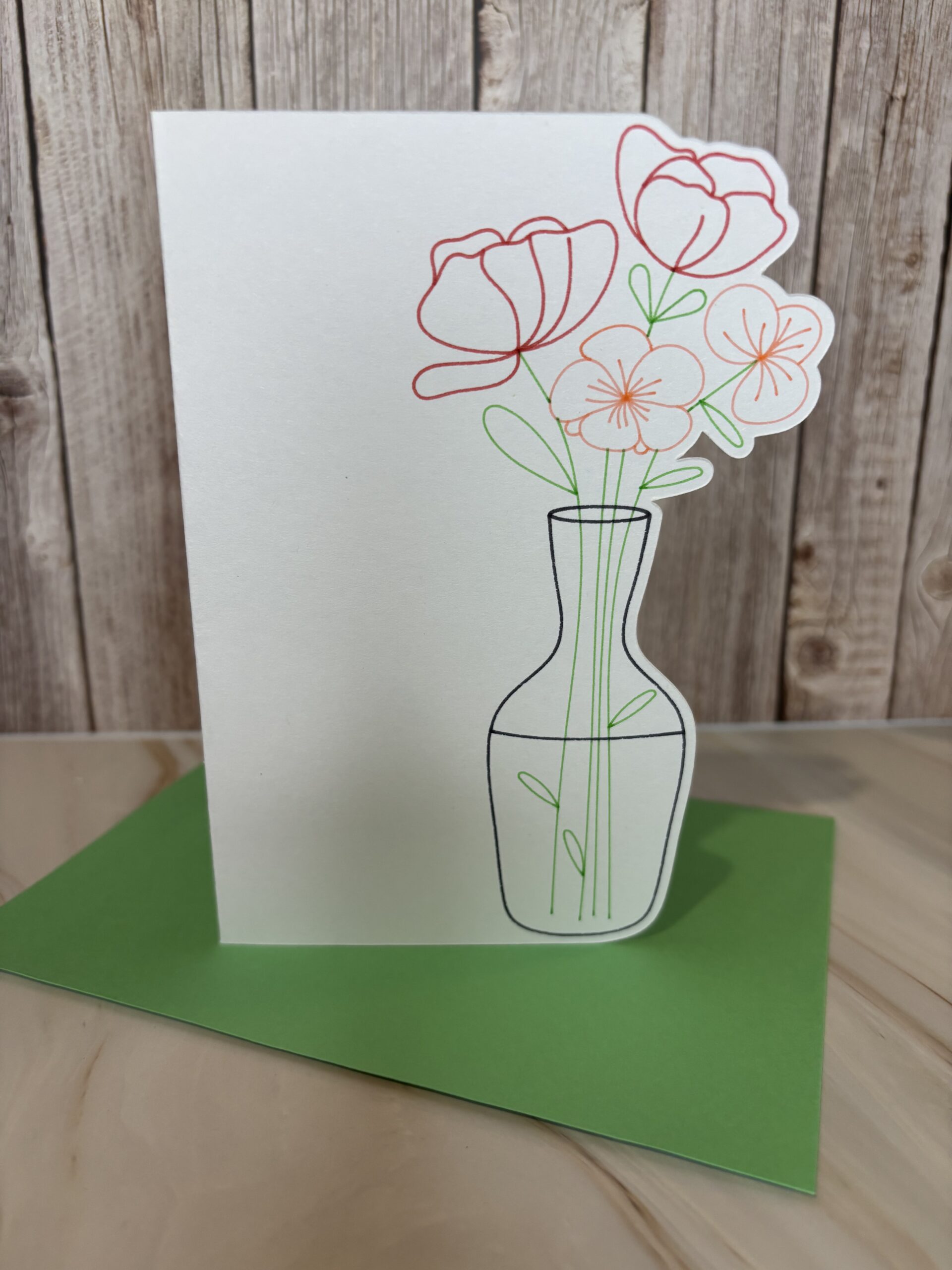 Dubbele witte kaart met vaas en bloemen , met groene envelop.