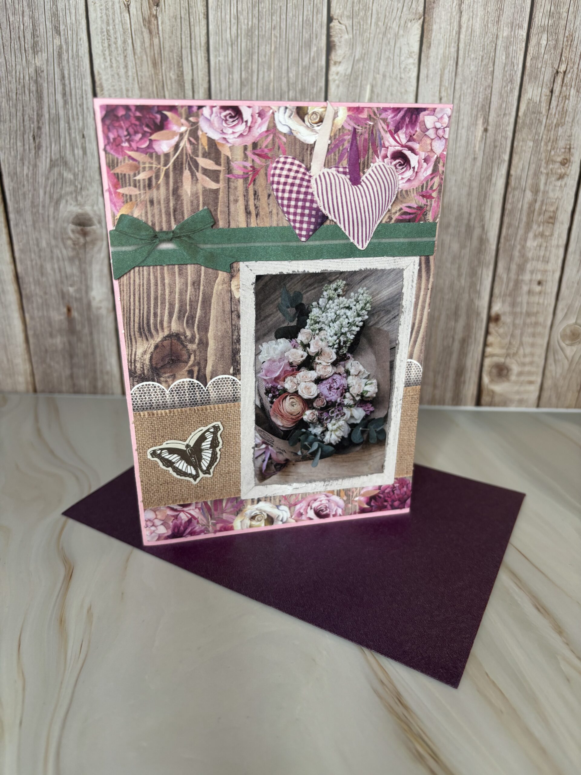 Dubbelgevouwen roze kaart met bloemen,vlinder,hartjes.