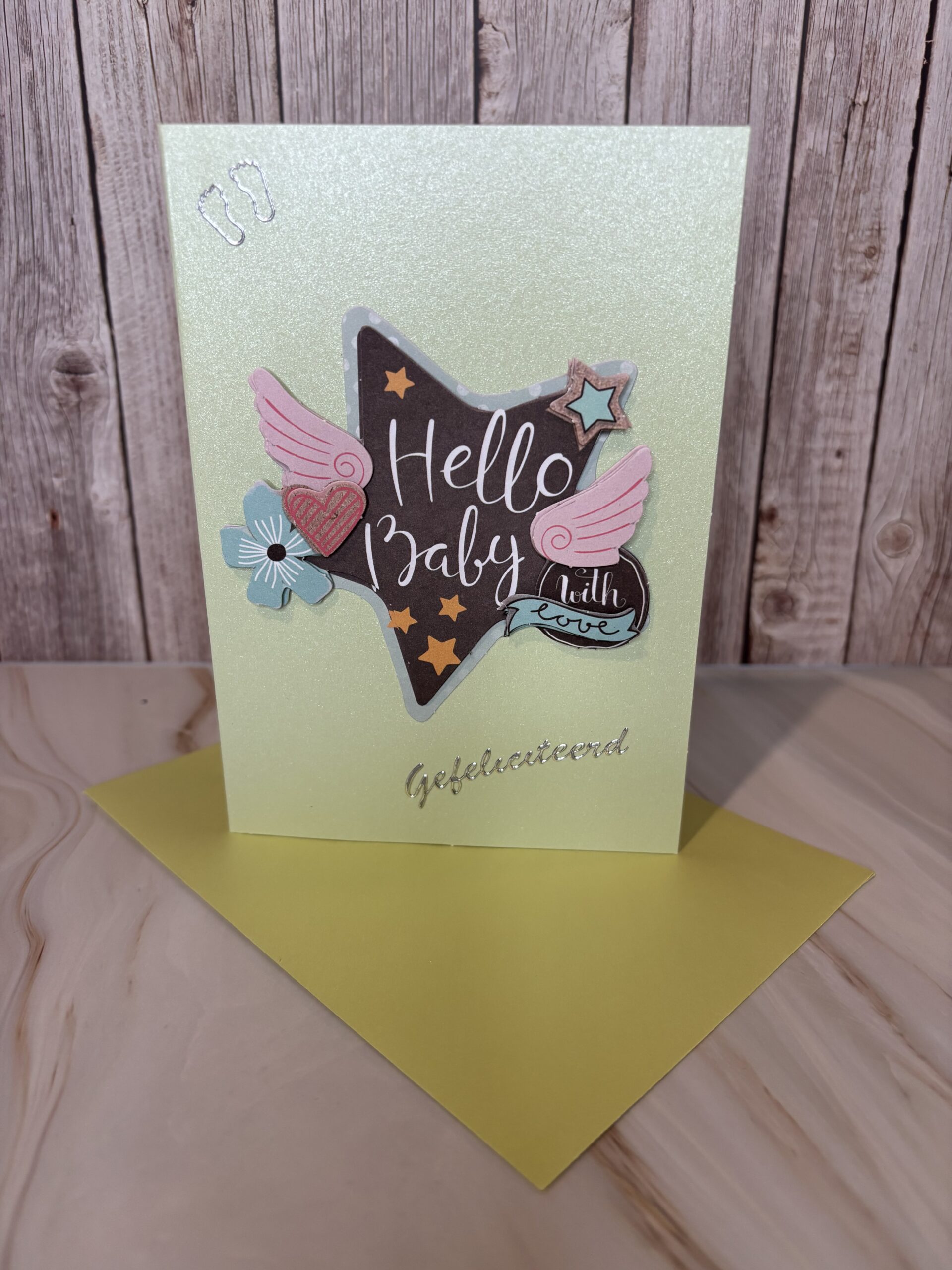 Dubbelgevouwen groene kaart met ster en roze engelvleugeltjes